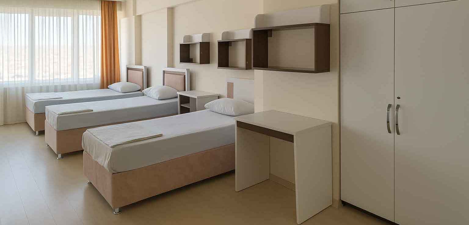 Yurt odalarında sandıklı baza, ortopedik yatak, çalışma masası, elbise dolabı, kitaplık ve mini buzdolabı bulunmaktadır. Her oda, öğrencilerin eğitim ve yaşam ihtiyaçlarına uygun şekilde modern bir anlayışla dizayn edilmiştir. Öğrencilerimize güvenli, konforlu ve düzenli bir yaşam alanı sunmak en büyük önceliğimizdir.